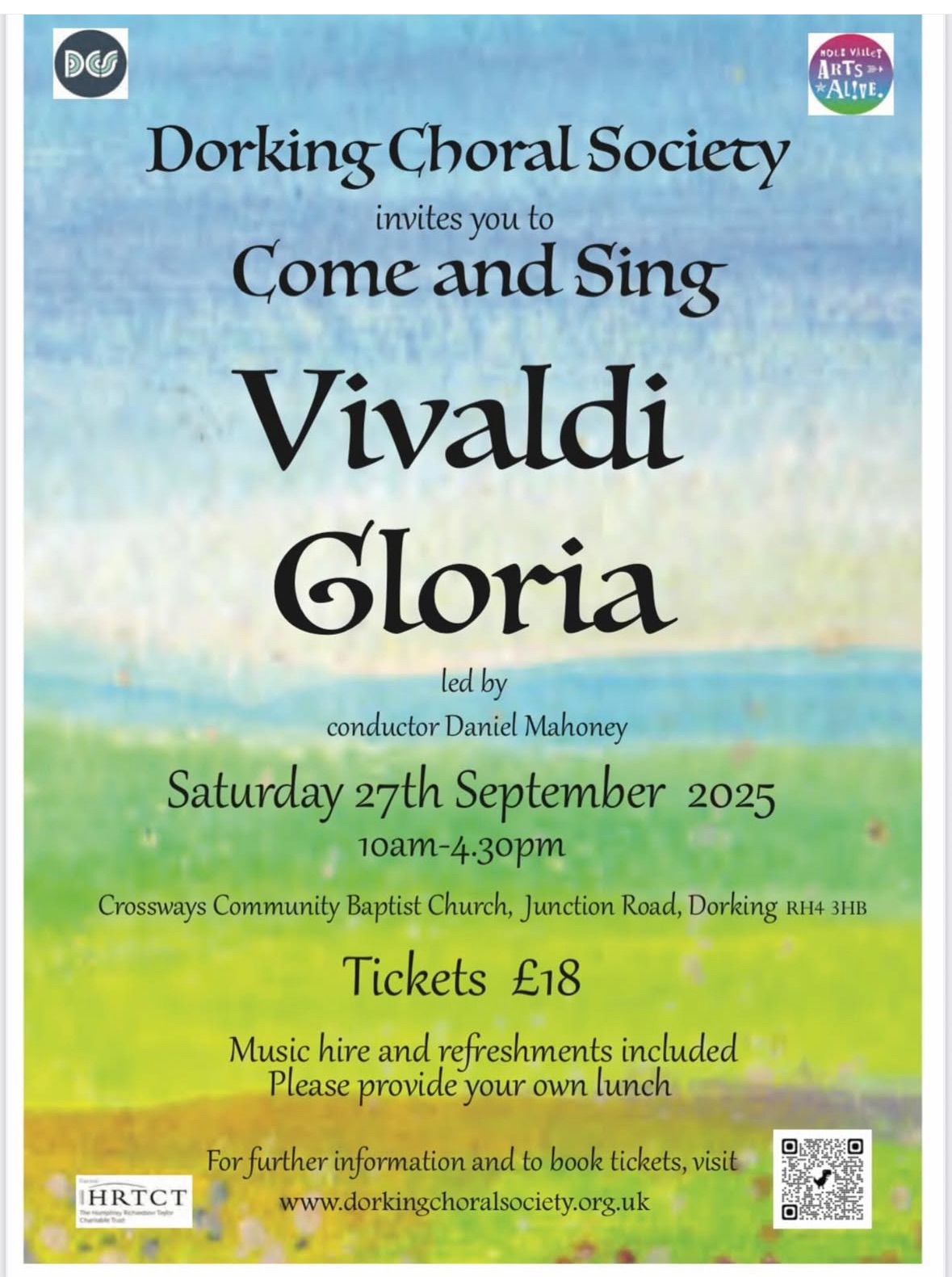 Dorking Choral Society invites you to our 'Come and Sing' of Vivaldi Gloria, led by conductor Daniel Mahoney. The event will be from 10am to 4:30pm, at: